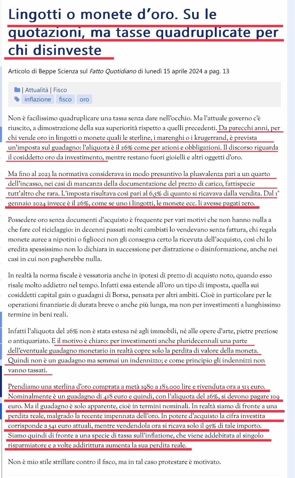 LINGOTTI O MONETE D’ORO - TASSE QUADRUPLICATE PER CHI DISINVESTE